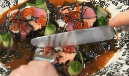 6. Выложить начинку на ломтики багета. Сверху сбрызнуть оливковым маслом, посолить.