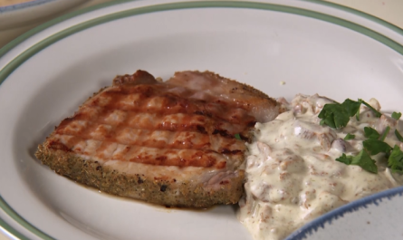 15. Выложить готовый зелёный рис на тарелку, посыпать тёртым сыром, в центр – кальмар в сливочном соусе.