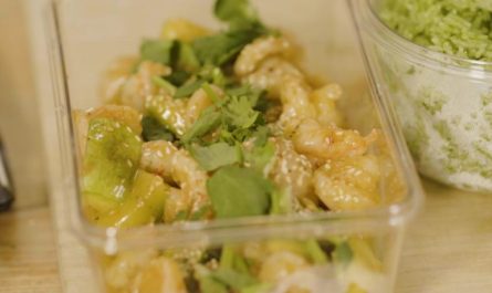 7. Заправьте салат соусом. Добавьте кусочки помело и жареные креветки.