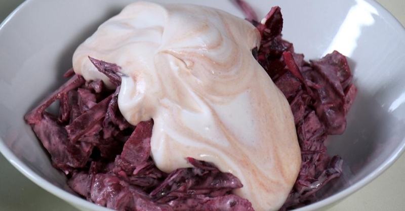 пюре томатное — 2 ст. л. Выпуск «Красный салат от Сальвадора Дали. Краснокочанная капуста тушёная с ряженкой. Борщ с краснокочанной капустой, яблоком и кориандром» Программа «Кухня по заявкам»