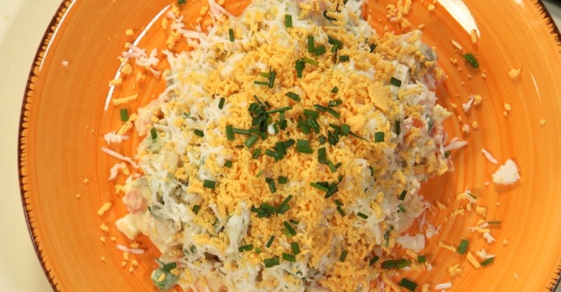 4. Креветки почистить, отварить пару минут в кипящей воде. Нарезать.