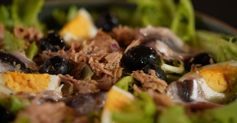 3. Добавьте кусочки тунца, анчоусы и оливки.
