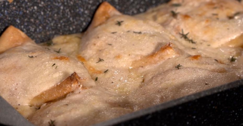 9. Смажьте форму для выпечки соусом, сверху выложите блинчики. Полейте их бешамелем и посыпьте пармезаном. Добавьте несколько кусочков сливочного масла.