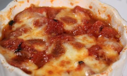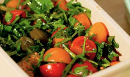 17. Выложить салат на тарелку, украсить моцареллой, рядом — нарезанный стейк на тонкие слайсы.