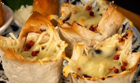 5. Сверху посыпаем натёртым на крупной тёрке сулугуни.