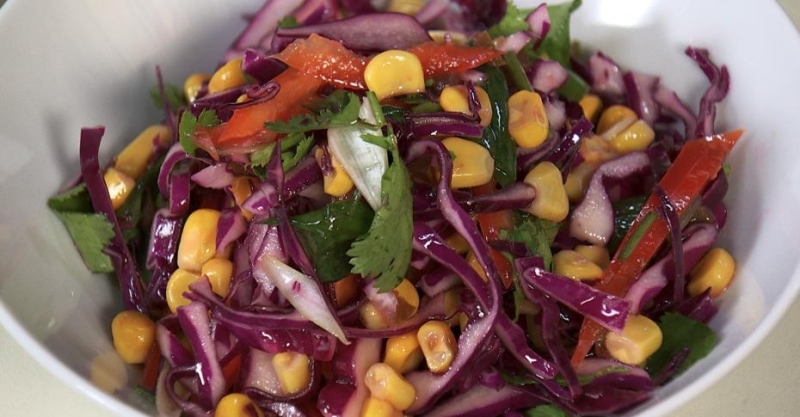 2. В миске собираем капусту, кукурузу, нарезанные болгарский перец, зелёный лук, кинзу, перец халапеньо.