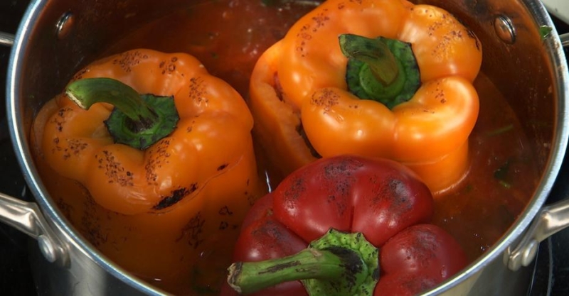 11. Выложить перцы в соус, накрыть крышкой. Томить в течение 15-20 минут.