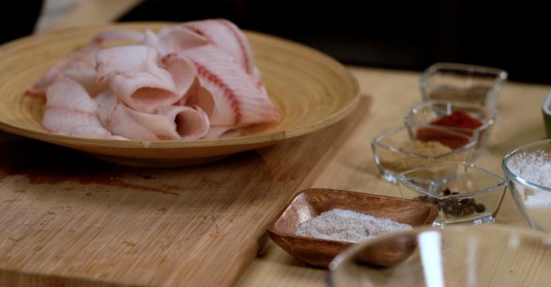 2. Возьмите тушку за хвост, уприте рыбу головой в стол. Снимите ножом тонкие стружки мяса.