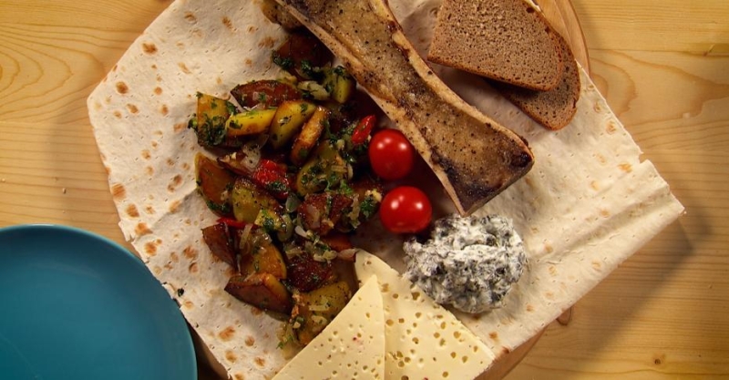 8. Выложите на лаваш картофель, осетинский сыр, листья перцев со сметаной, хлеб и запечённый костный мозг. Готово!